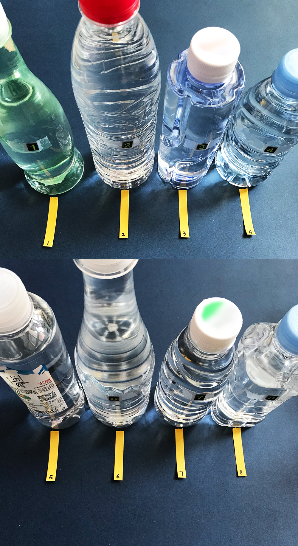 对8款水进(jin)行编号盲测,并通过pH值(zhi)对比进(jin)行由(you)碱—酸(suan)排序;为(wei)降低误(wu)差,我们分别选(xuan)取三种不(bu)同品牌pH试(shi)纸进(jin)行三次实验。评测,我们是认(ren)真(zhen)哒!